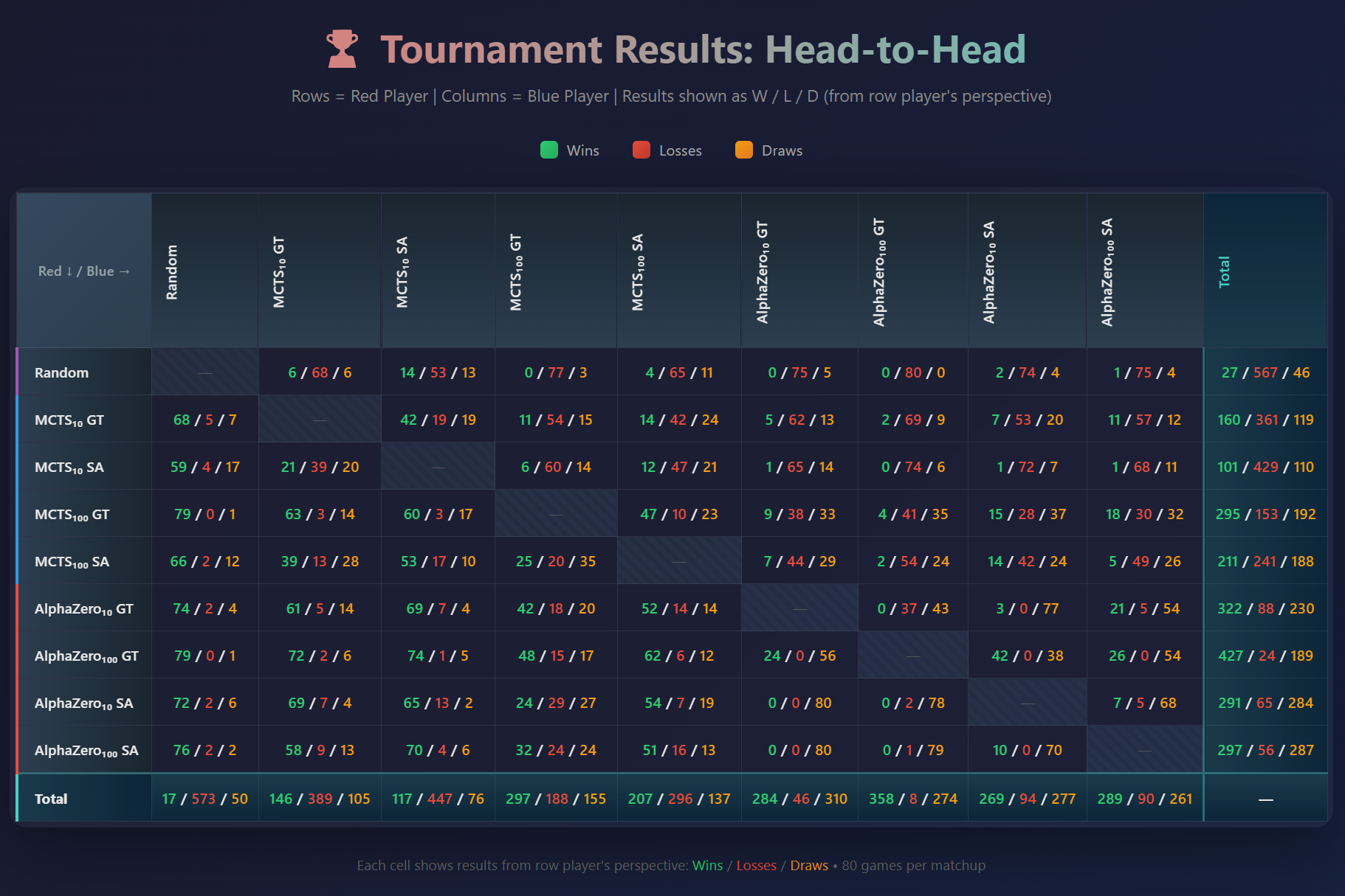 Figure 1: Full round-robin tournament results for all nine agents. The best agent, AlphaZero_100 GT, lost 24 games playing as red and 8 games playing as blue. Interestingly it did not lose any games to any of the other AlphaZero agents. This result probably means it just hasn’t been trained long enough to see the strategies the other agents are using, and if I kept training it, it would probably at some point become unbeatable.